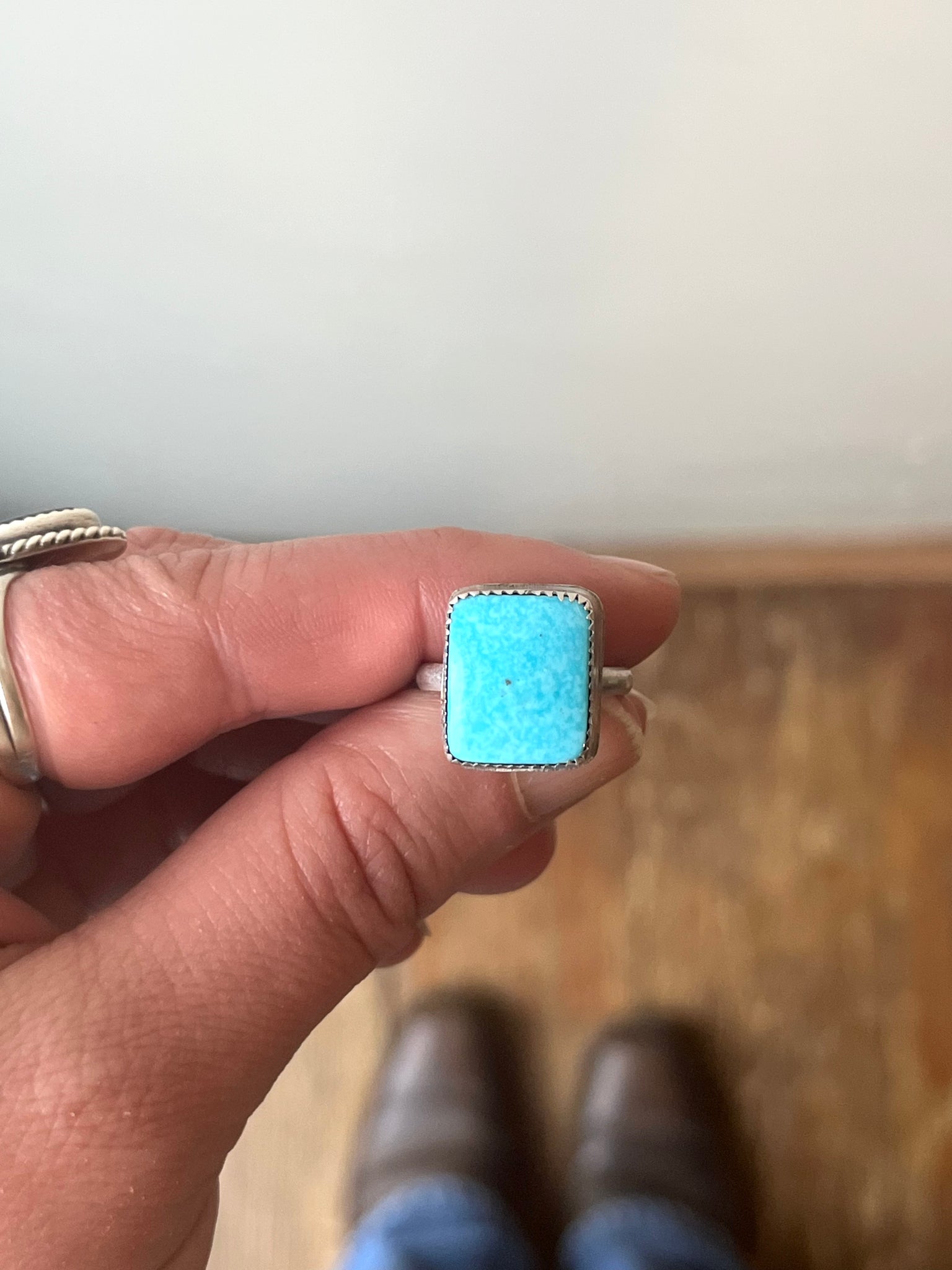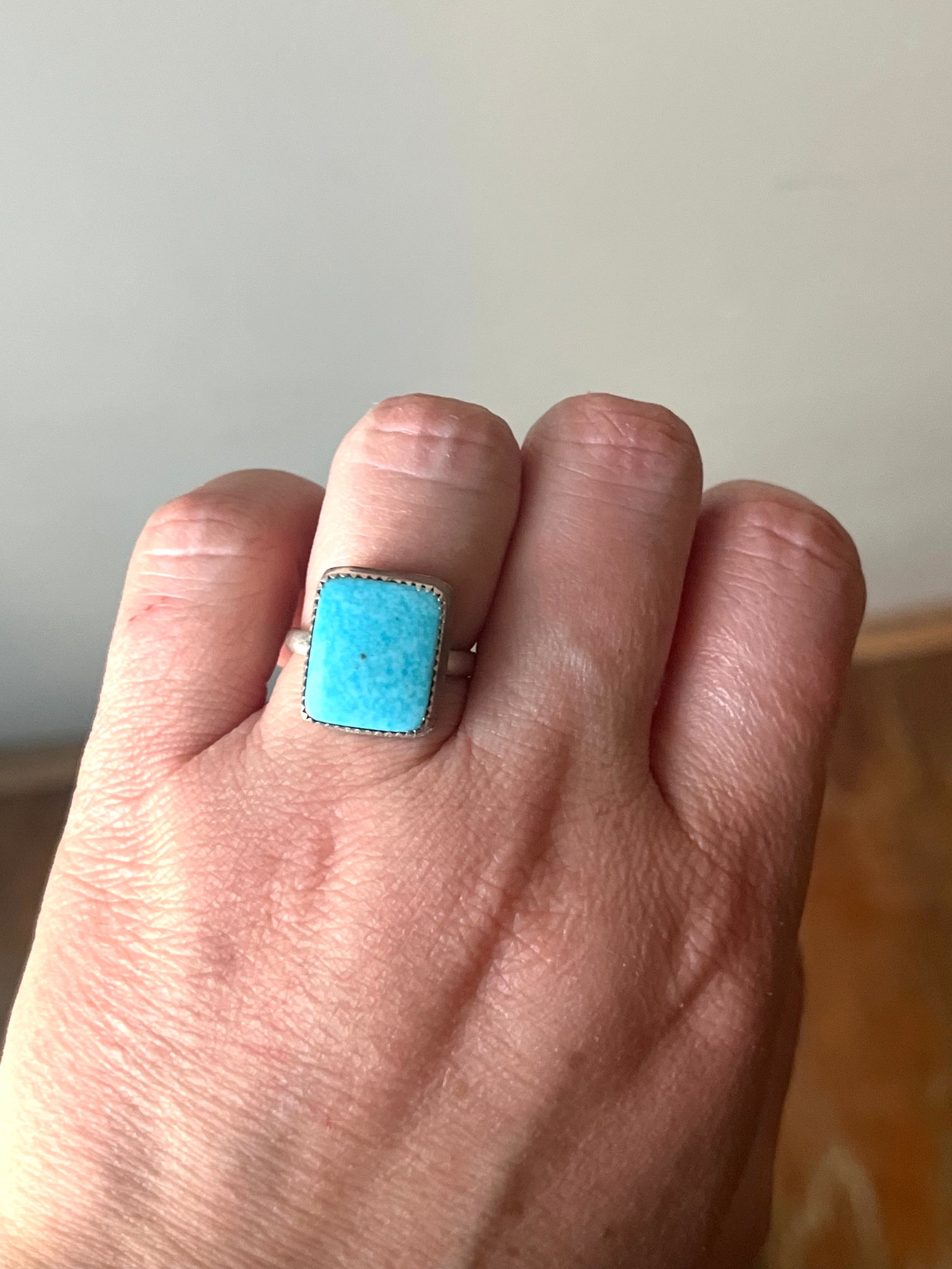 This is a sterling silver ring with a large turquoise rectangle stone setting. Size 6 1/2 to 7. It’s a little in between. It’s beautiful and chunky.