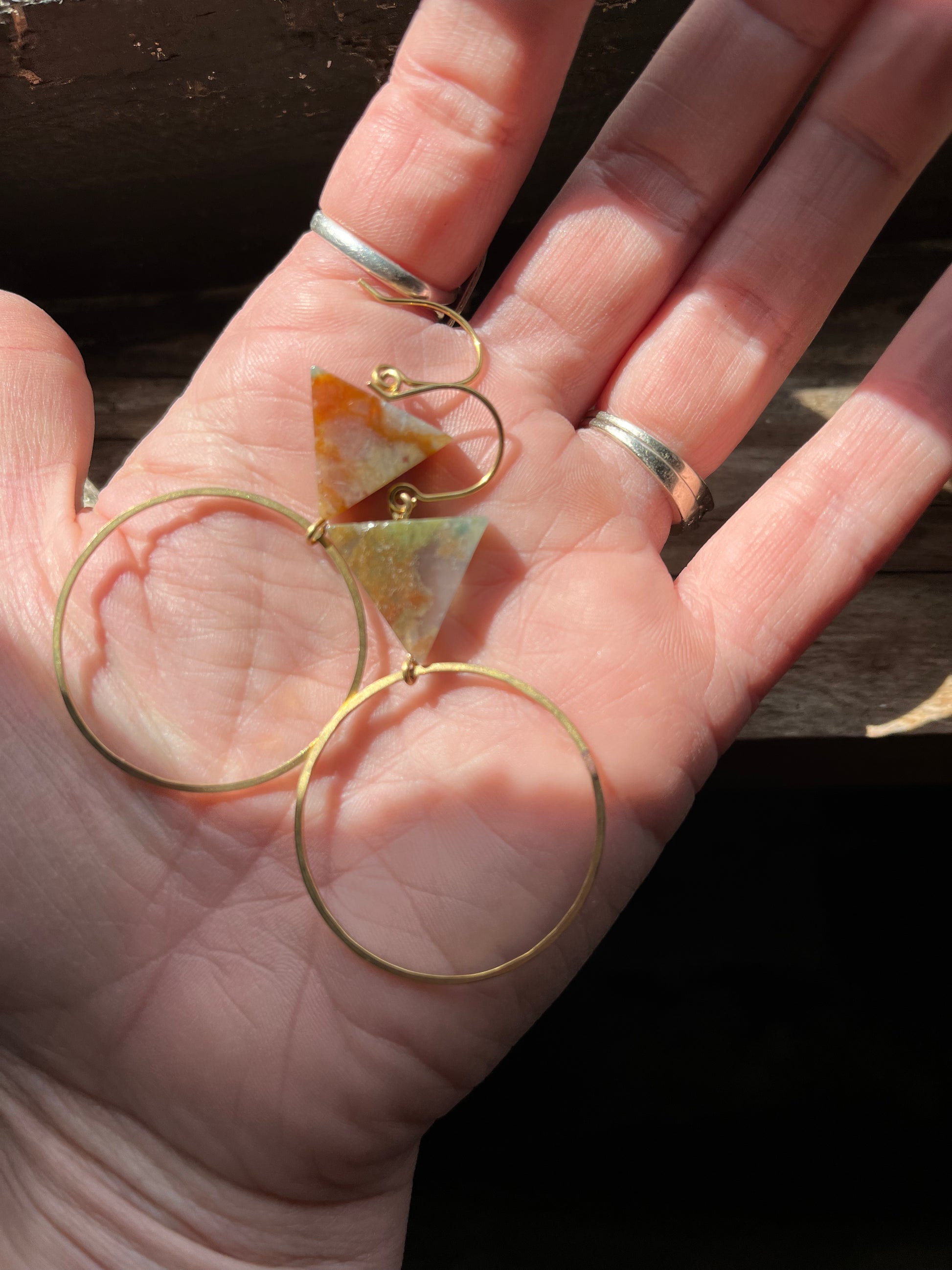 Lightweight hammered brass earrings feature these gorgeous fancy jasper, triangle gemstones. The colors are a swirly variety of greens, yellows, and pinks. They are SO pretty, every single pair. Measuring just over 2” long on brass ear wires.