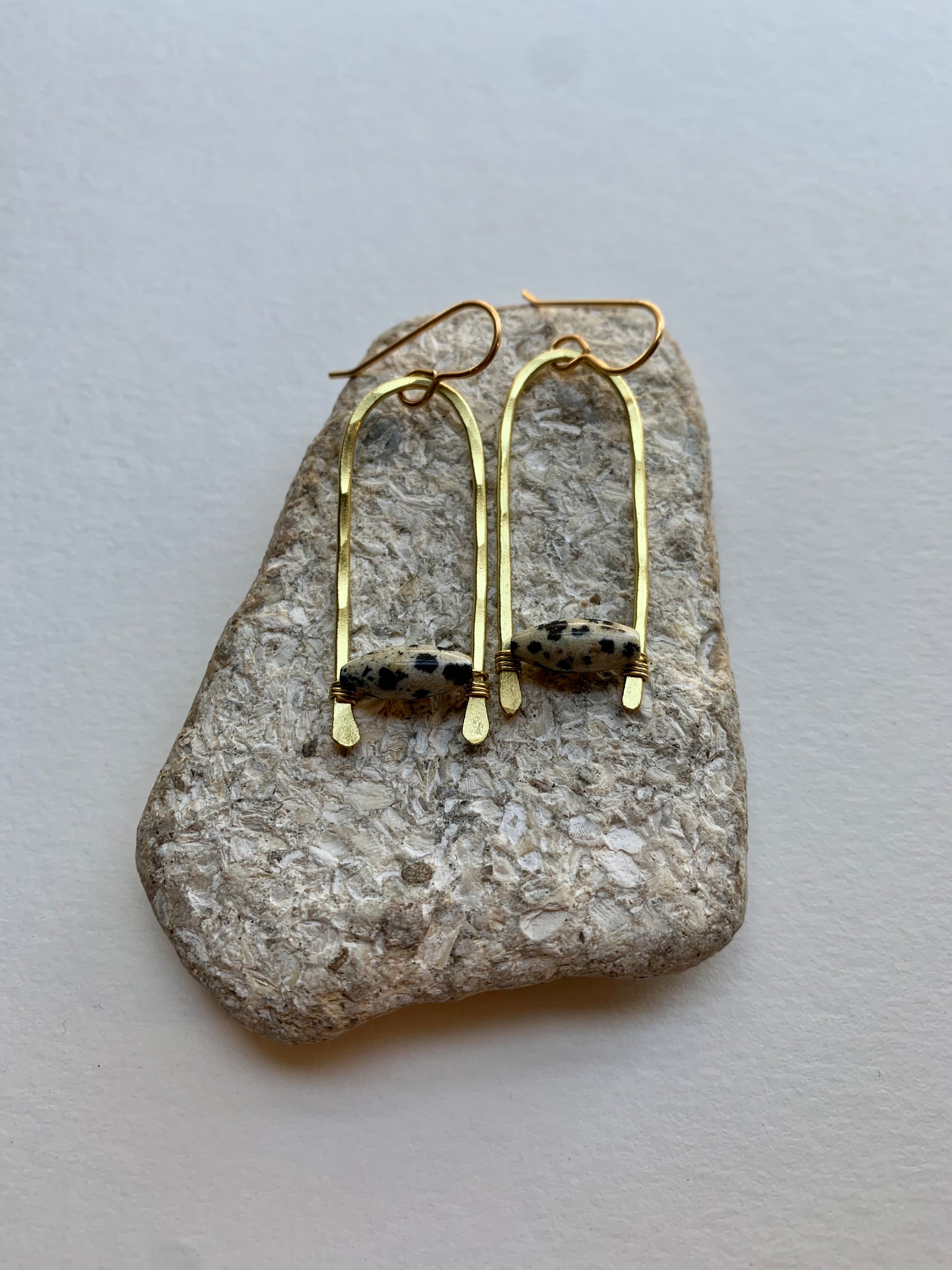 Gorgeous handmade brass arches with hammered surface details wire wrapped with Dalmatian Jasper beads. These hand from raw brass ear wires 1.5” long.
