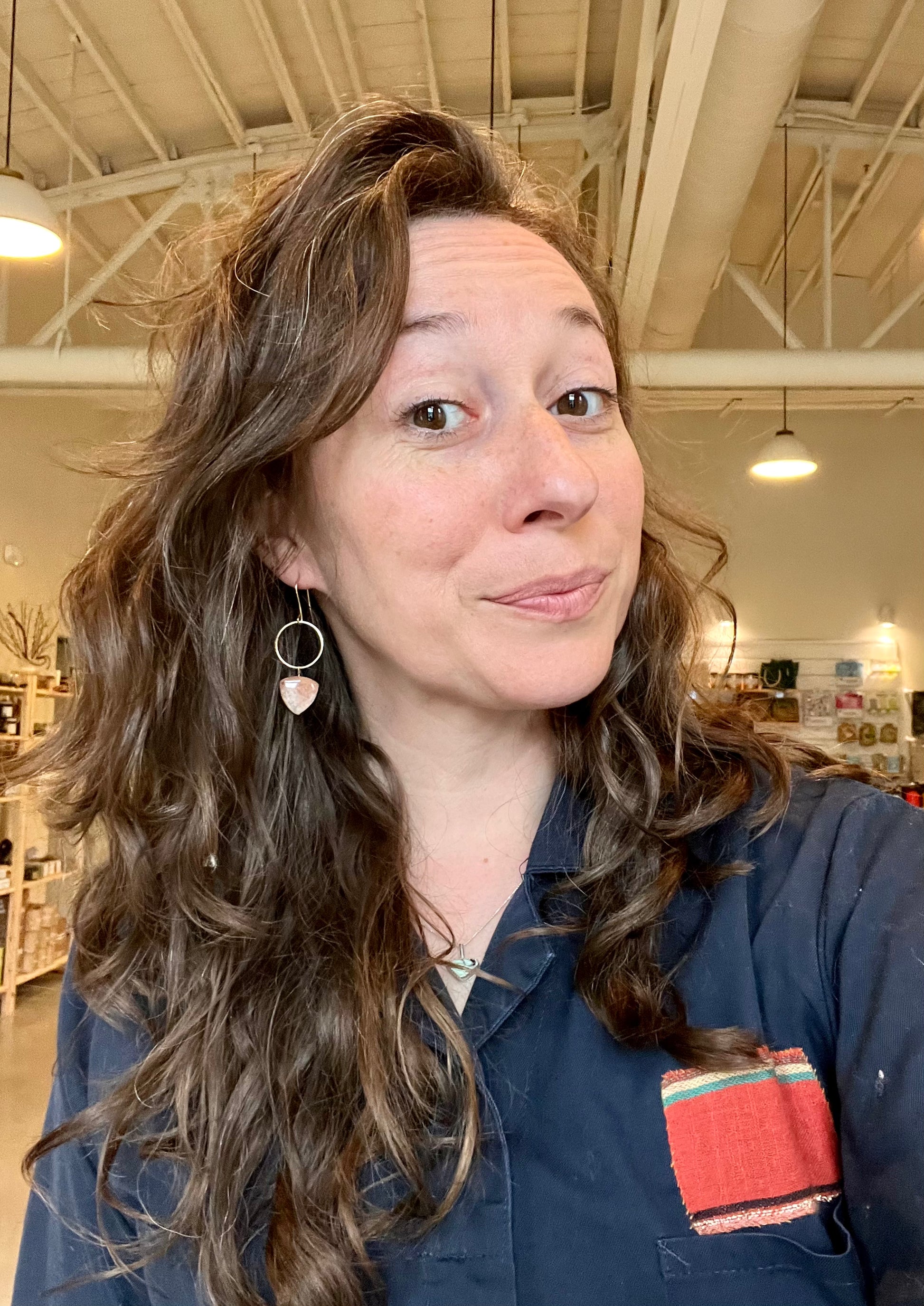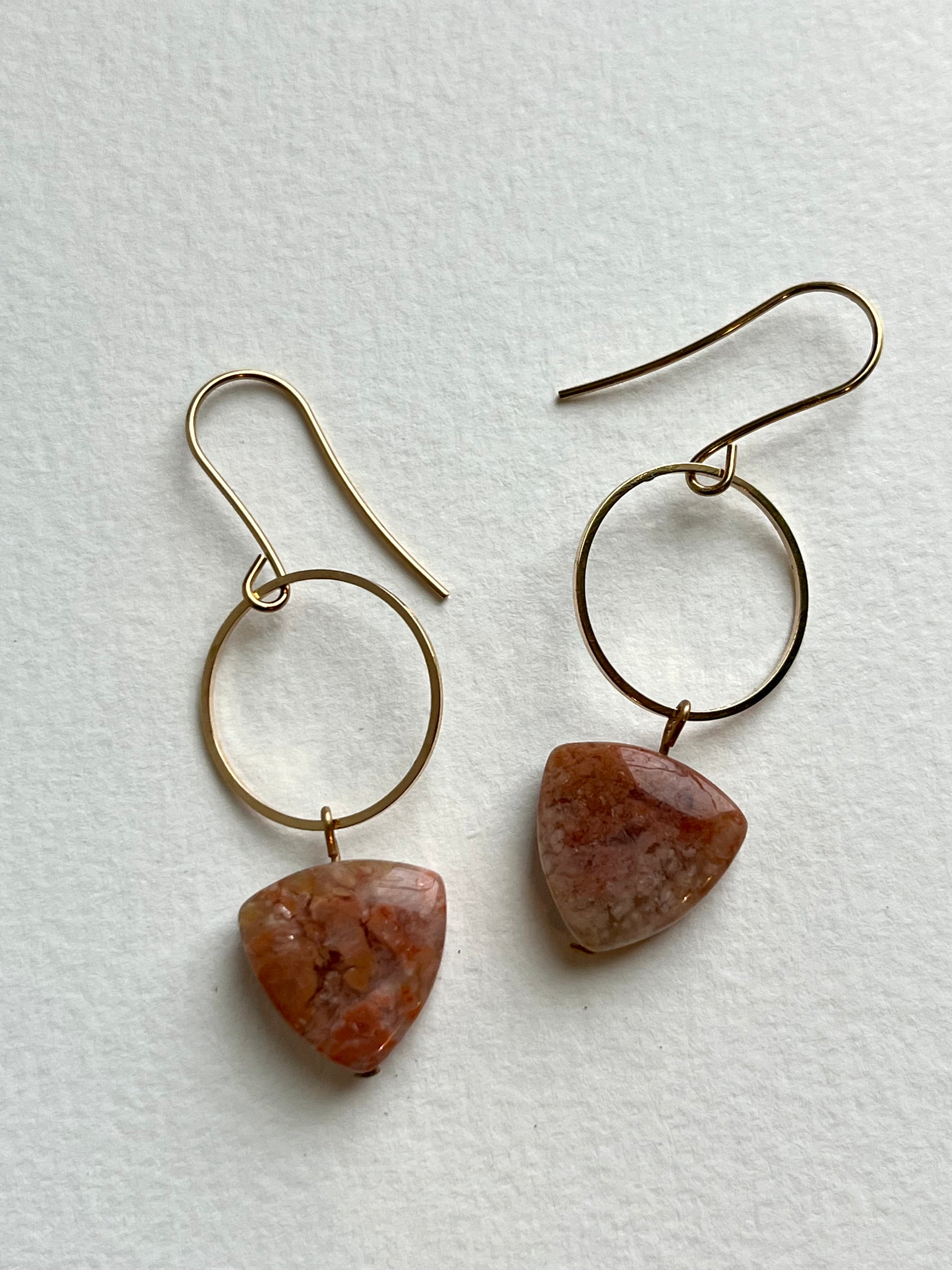 Pink moss agate is a gentle stone known to promote self love and emotional healing. Besides that, it is beautiful and varied. It reminds me of the sky at sunset. Paired with a shiny gold ring and brass ear wires. 2 inches long.